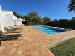 In the guest villa, there is an entrance hall, living room, and dining area, with access to an uncovered terrace with a large awning, and to the pool area. The kitchen is very spacious and also has access to the underground storage. It has two large double bedrooms, each with access to the terrace and pool area, as well as a shower.